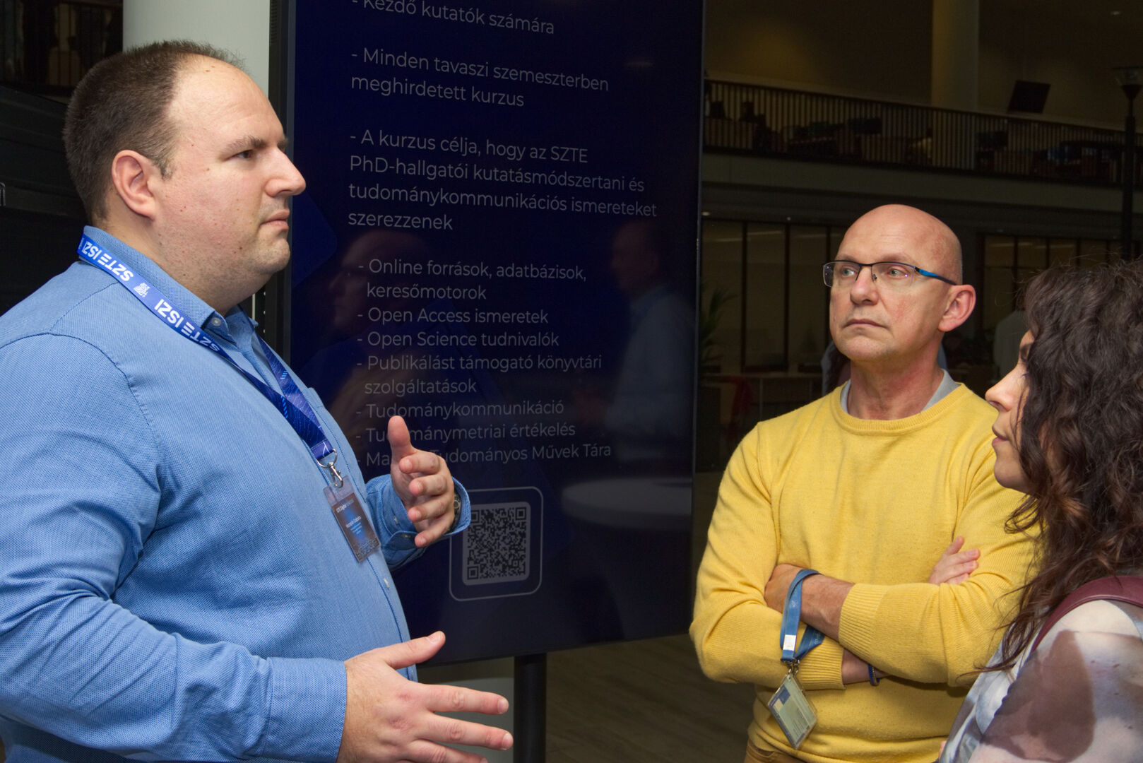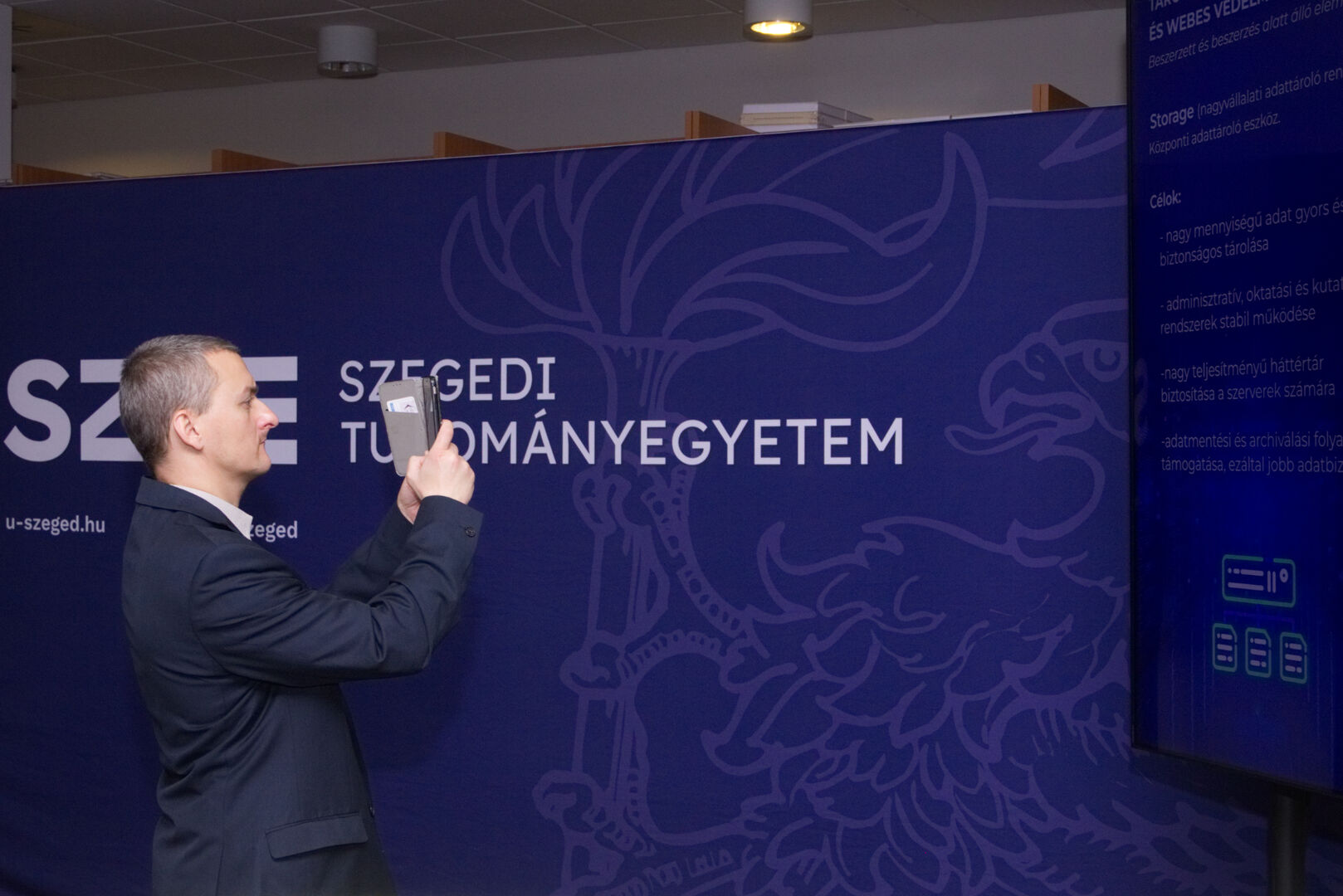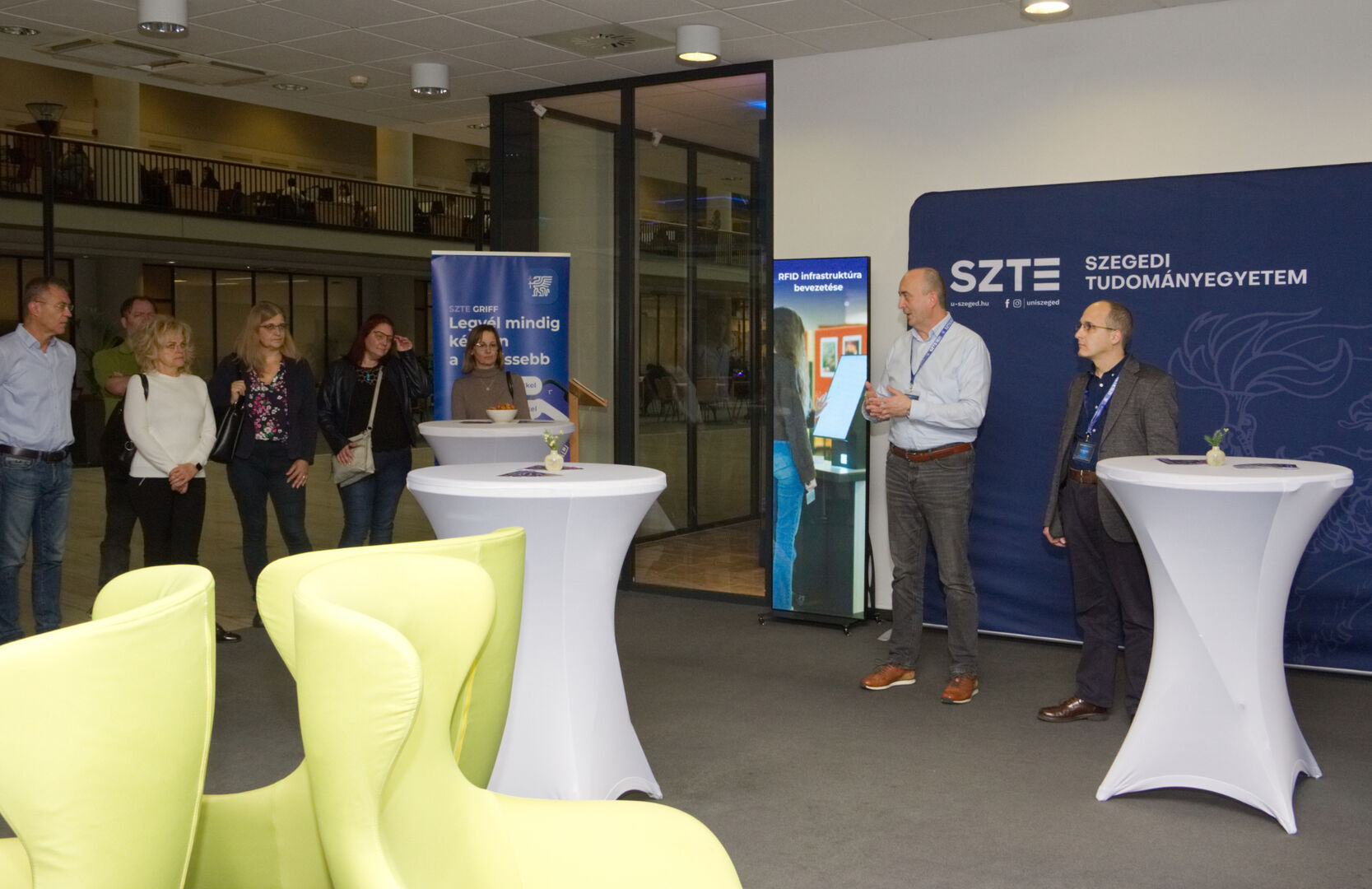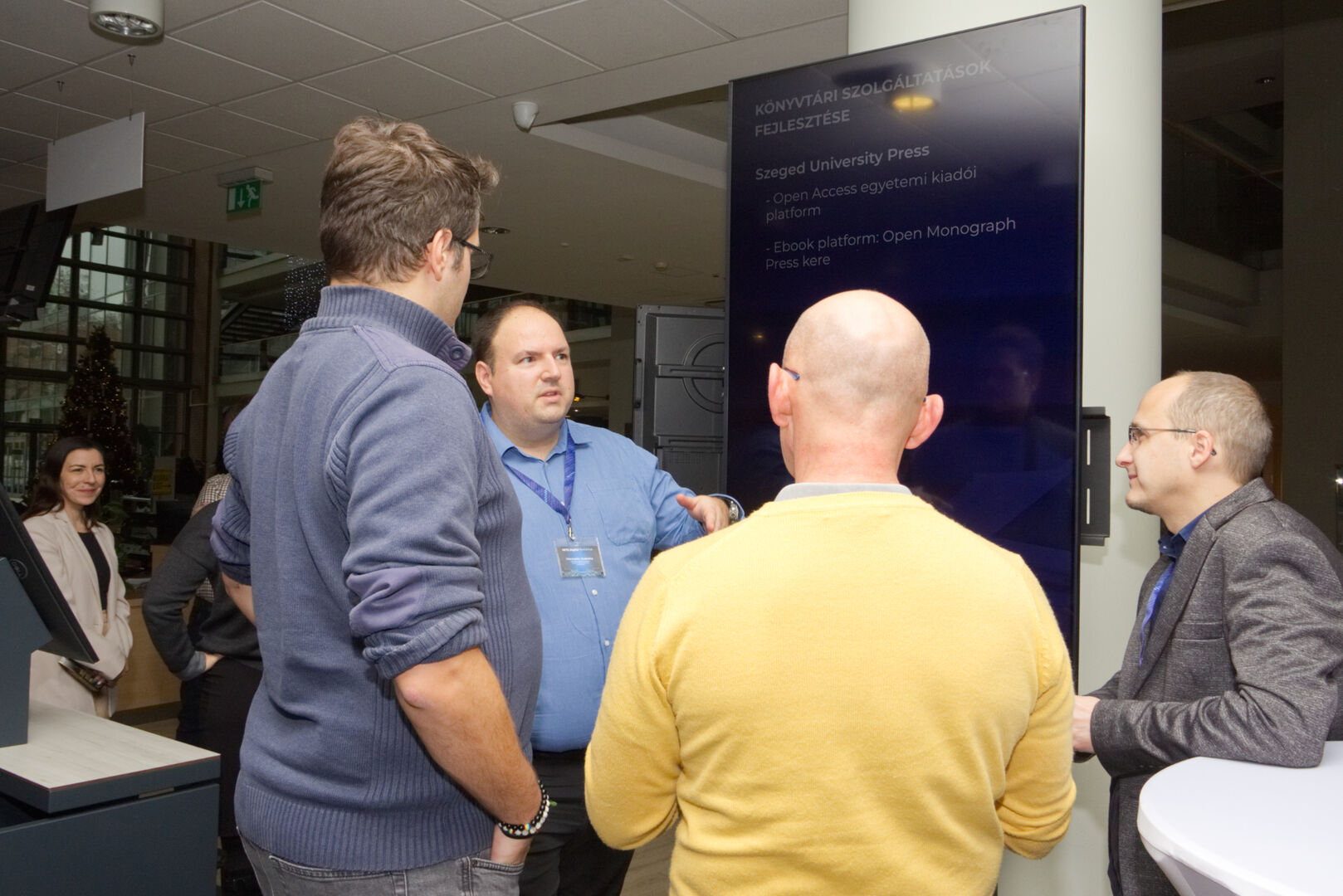 A Komplex digitális modellváltás – intelligens fokozatváltás projekt digitális fejlesztésekért felelős alprojektjének vezetője, Fekete Csaba, informatikai és szolgáltatási igazgató, valamint a projektben zajló könyvtárinformatikai fejlesztések felelőse, Dr. Nagy Gyula, a Klebelsberg Könyvtár és Levéltár főigazgatója közös eseményre invitálták az egyetem vezetőit és a projekt megvalósulását támogató munkatársakat decemberben. A programon digitális kijelzőkön és ledposztereken futó információs anyagok formájában, digitális kiállítással mutatták be az elmúlt időszak fejlesztéseit, amelyen a résztvevők a kiállítás megtekintése közben az egyes fejlesztési területek felelőseit kérdezhették kötetlen beszélgetések formájában.